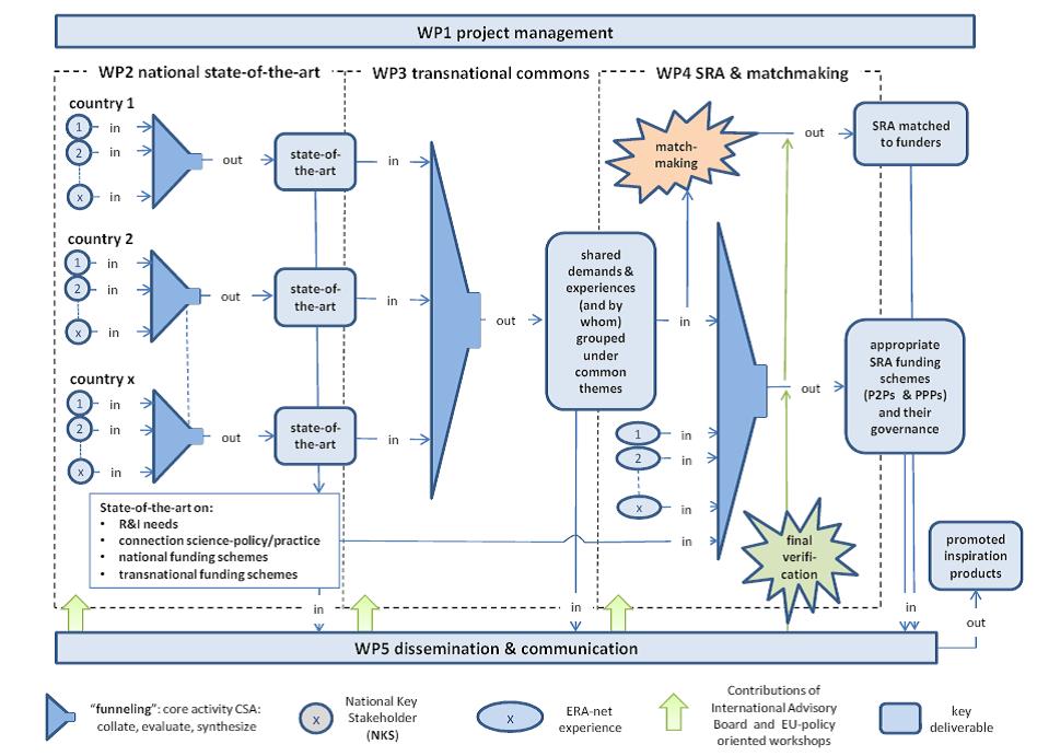 A key-activity in INSPIRATION was – as it is typical for a Coordination and Support Action – the collation, review and synthesis of information. This iwas the core activity of WP2 – 4 and this activity is graphically represented as a ‘funnel’: collated information enters the funnel as ‘input’, where it is reviewed and synthesized. This was done mainly in workshops preceded and finalized by deskwork and working meetings with consortium members active in the specific WP. The synthesized information exited the funnel as ‘output’, i.e. key deliverables of the project.